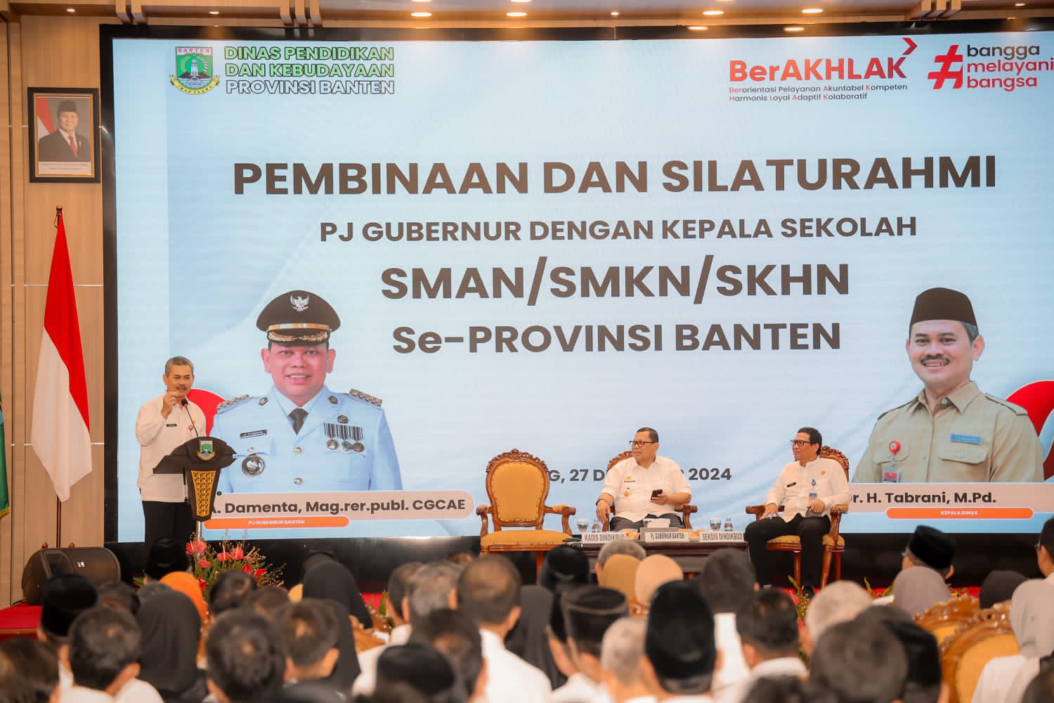 SERANG – Penjabat (Pj) Gubernur Banten A Damenta melakukan silaturahmi bersama ratusan Kepala Sekolah (Kepsek) SMAN/SMKN dan SKhN di Pendopo Gubernur Banten, KP3B Curug, Kota Serang, Jumat (27/12/2024).