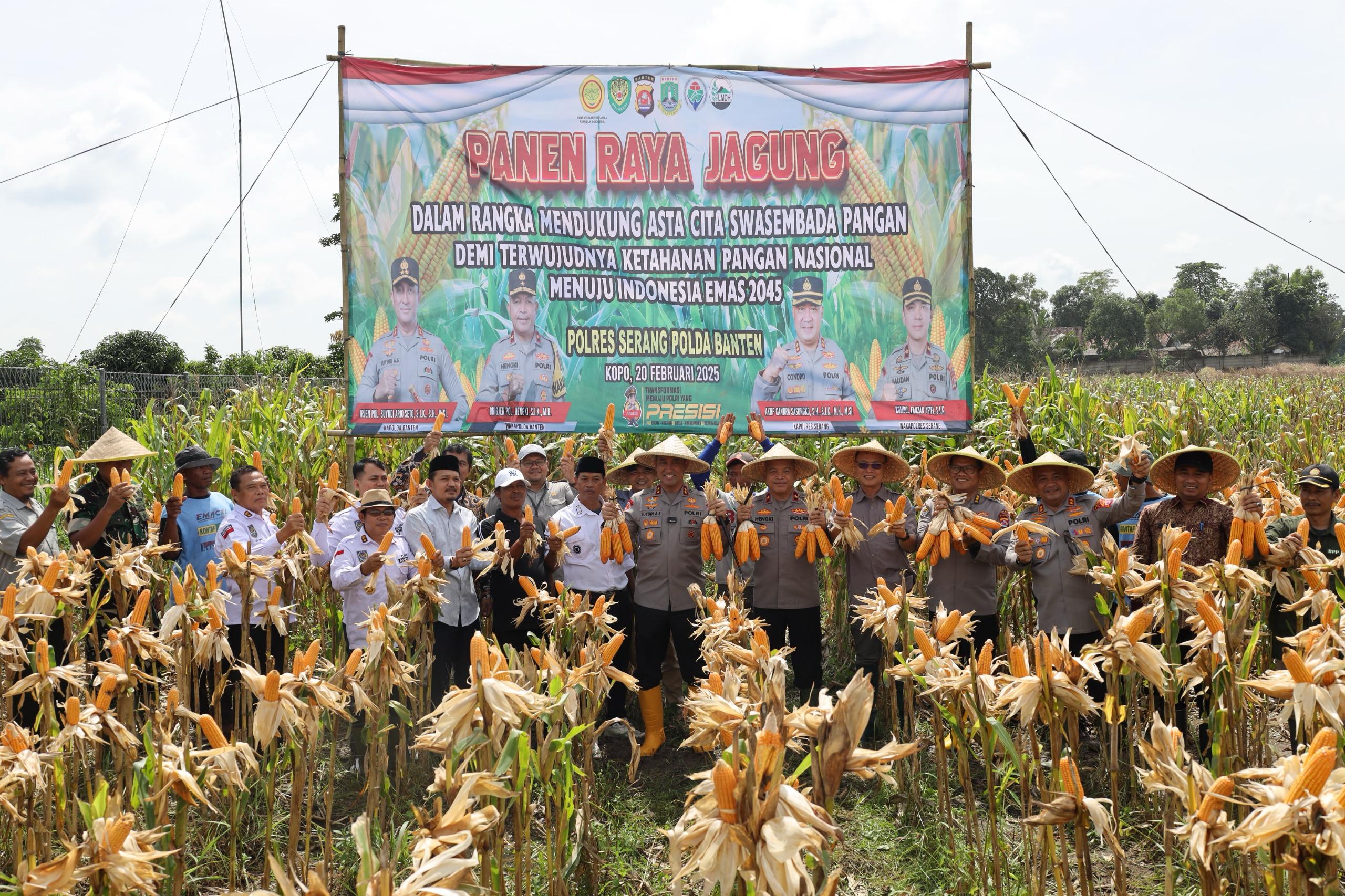 SERANG – Kapolda Banten Irjen Suyudi Ario Seto bersama Kapolres Serang AKBP Condro Sasongko melaksanakan panen raya dan penanaman benih jagung dalam rangka mendukung program Asta Cita Swasembada Pangan yang dijalankan Polres Serang, Kamis (20/02).